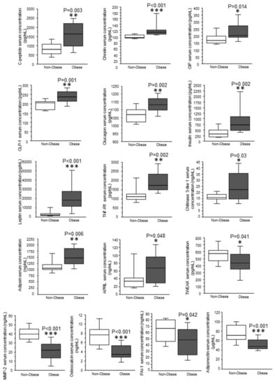 Changes in protein serum levels due to obesity. Box-plot diagram showing the effect of obesity on the serum proteomic profile. Data represented as mean ± SEM, statistical analysis was performed by Mann–Whitney U tests. * p < 0.05; ** p < 0.01; *** p < 0.001.