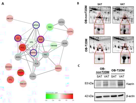 Differential proteomic signature of VAT and SAT. (A) Protein–protein interaction network analysis of visceral versus subcutaneous adipose tissue differentially expressed proteins. Nodes coloring represents log fold-change between VAT and SAT; gray nodes represent predicted protein interactions; nodes highlighted in purple represent predicted proteins that were detected within the proteomic analysis but did not reach significance. Red up regulated and green down regulated. (B) Representative two-dimensional electrophoresis image of adipose tissue with kazrin spot (MW: 86 kDa, pI: 6.6) highlighted in a circle. (C) Kazrin protein expression in SAT and VAT from class III obese (OB) individuals with and without type 2 diabetes (T2DM or nonT2DM). Blots are representative of 6 independent experiments.