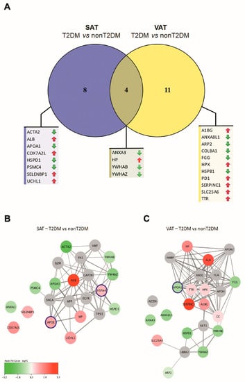 Effect of type 2 diabetes mellitus upon visceral and subcutaneous white adipose tissue proteomes. (A) Venn diagram of differentially regulated proteins in type 2 diabetes mellitus individuals (T2DM) compared to non-type 2 diabetes mellitus individuals (nT2DM) for VAT and SAT depots. Only proteins with significant protein expression changes (p < 0.05) were included, red arrows upregulated, green arrows downregulated. (B) Protein–protein interaction network analysis of VAT differentially expressed proteins in T2DM. (C) Protein–protein interaction network analysis of SAT differentially expressed proteins in T2DM. Nodes coloring represents log fold-change between T2DM and nT2DM; gray nodes represent predicted protein interactions; nodes highlighted in purple represent predicted proteins that were detected within the proteomic analysis but did not reach significance.