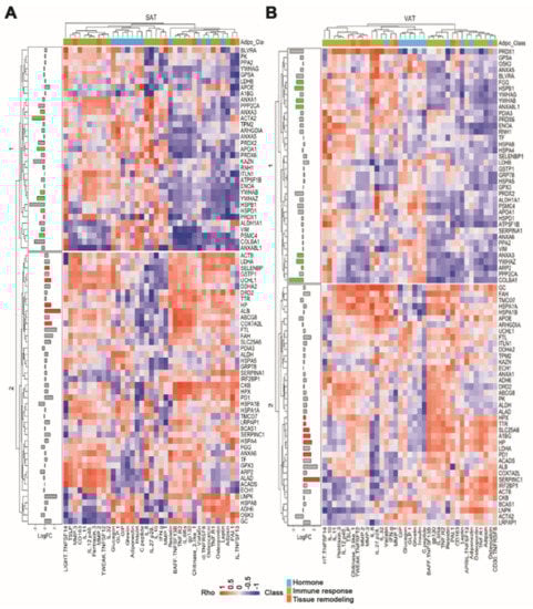 Finally, we explored whether the proteomic composition of VAT and SAT affects the serum adipokine signature. With this purpose, Spearman’s Rho correlation coefficient was calculated for every pair of AT proteins/adipokines and employed to build a heatmap. Hierarchical clustering was then applied to identify regulatory modules. As a result, strong correlations were found for multiple AT proteins/adipokines pairs, and two clusters exhibiting opposite correlation coefficients were clearly identified for both VAT and SAT (Figure 5) proteomes. Remarkably, in both cases, the cluster exhibiting an overall positive correlation with the adipokines profile included all significantly up-regulated proteins in T2DM, whereas the overall negatively correlated cluster included all significantly down-regulated proteins.
