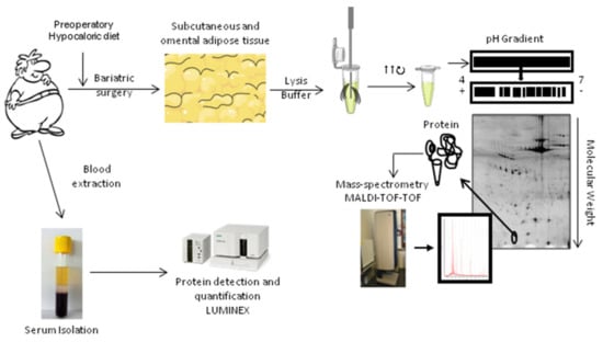 VAT and SAT samples were also obtained from twelve class III obese patients at the time of blood extraction during surgery. These were processed for untargeted proteomics in OB-nonT2DM individuals (n = 6) and in OB-T2DM individuals (n = 6) with fully characterized demographics (Table 7 and Figure 6). AT was collected under sterile conditions; samples were washed in phosphate-buffered saline and immediately frozen in liquid N2. Samples were stored at −80 °C until protein extraction.