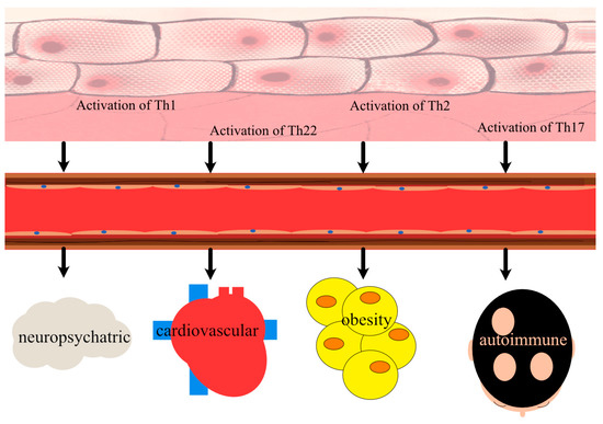 A comprehensive search of the literature using the PubMed (https://pubmed.ncbi.nlm.nih.gov/, accessed on 6 September 2022) electronic database using the search queries “(atopic dermatitis and comorbidities)”, “(atopic dermatitis and cardiovascular comorbidities)”, “(atopic dermatitis and neurological comorbidities)”, “(atopic dermatitis and psychiatric comorbidities)”, and ‘’(atopic dermatitis and autoimmune comorbidities)” was performed in the second week of September 2022 from the database inception to the 16 September 2022. Further research were used to conduct a comprehensive search of literature: “(atopic dermatitis and vascular inflammation)”, “(atopic dermatitis and coronary artery disease)”, “(atopic dermatitis and artherosclerosis)”, “(atopic dermatitis and thrombosis)”, “(atopic dermatitis and neuro-immune crosstalk)”, “(atopic dermatitis and epilepsy), “(atopic dermatitis and autism)”, “(atopic dermatitis and attention deficit hyperactivity disorder), “(atopic dermatitis and depression)”, “(atopic dermatitis and alopecia areata), “(atopic dermatitis and vitiligo)”, “(atopic dermatitis and chronic urticaria)”, and “(atopic dermatitis and celiac diseases) were performed in the third week of September 2022 from the database inception to the 1 October, and “(atopic dermatitis and type I diabetes)” and “(atopic dermatitis and obesity)” were performed in the third week of September 2022 from the database inception to the 28 September 2022. After the initial search, the inclusion and exclusion criteria were applied to the titles and abstracts. On the basis of the analysis of titles and abstracts, we included articles on the causes of the increased co-occurrence of atopic dermatitis (genetic factors, immunological factors, exposure to modifiable risk factors).