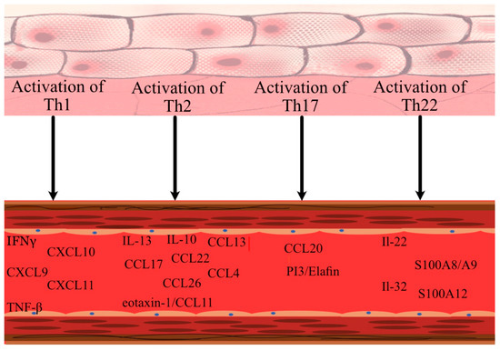 Variation in endotypes and lifestyle choices between nations may account for the observed differences [26,27]. While the higher cardiovascular risk in psoriatic patients as, at least to some extent, a result of elevated levels of immune and cardiovascular proteins is a well-established concern, the data on AD are less researched and still emerging [28]. Firstly, AD patients and psoriatic patients share an increase in several inflammatory and cardiovascular risk markers in their blood serum, including T helper (Th)1 (interferon gamma (IFN-γ), tumour necrosis factor alpha (TNF-α), and Th17 (C-C motif chemokine ligand 20 (CCL20)) (Figure 2) [28]. Others, however, proved to be uniquely significantly elevated in the blood of AD patients; these included some atherosclerosis (fractalkine/CX3C motif ligand 1 (CX3CL1), macrophage-colony-stimulating factor (M-CSF)), T-cell development and activation (cluster of differentiation 40 ligand (CD40L), interleukin (IL)-7, CCL25), and angiogenesis (vascular endothelial growth factor A (VEGF-A)) markers [28]. Atypically, AD patients demonstrated a positive connection between Th2-related cytokines (CCL17, CCL22), Th22-related cytokines ((IL-22, myeloid-related protein (MRP8/14), and IL-32), and vascular inflammation, especially given that atherosclerosis is a Th1-dominated illness and the role of Th2-produced cytokines remains contentious (Figure 2) [29]. Serum indicators positively correlated with severity of AD as assessed by the scoring atopic dermatitis (SCORAD) scale, but were unrelated to body mass index (BMI) [28,29]. Additionally, dupilumab treatment reduced the levels of cardiovascular indicators in the skin and blood of AD patients and significantly modified the atherosclerosis genes [29,30].