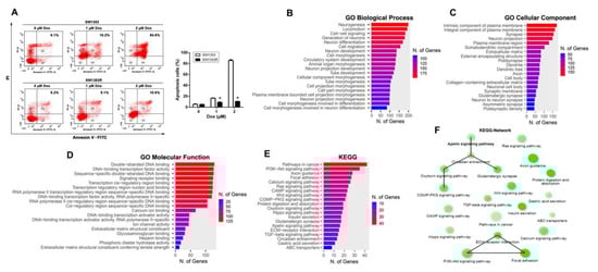 To explore the possible mechanism of Dox resistance in chondrosarcoma cells, a Dox-resistant SW1353 subline designated SW1353R was established by gradually increasing the drug concentration from 0.0625 μM to 2.0 μM for approximately six months. As shown in Figure 1A, the results of flow cytometry analysis showed that SW1353R cells were only approximately 10% cell death after treatment with 2 μM Dox for 24 h, while the parental SW1353 cells were more than 80% cell death, indicating that SW1353R is highly resistant to Dox. To identify candidate genes involved in Dox resistance in chondrosarcoma, we isolated RNA from SW1353 and SW1353R cells for RNA-Seq transcriptome analysis. A total of 1438 upregulated genes in SW1353R cells were identified using a threshold of |log2fold change (FC)| > 2 and padj value < 0.05. These genes were then subjected to bioinformatics analysis using the ShinyGO web server. The GO enrichment was obtained for the exploration of biological process, cellular component, molecular function, and KEGG using a false discovery rate (FDR) < 0.05. The most significant biological processes for upregulated genes involved neurogenesis, development, and differentiation; cell-cell signaling; and cell migration, organogenesis, and development (Figure 1B). The most significant cellular components for upregulated genes involved membrane protein components; nerve-related components; and extracellular matrix components (Figure 1C). The most significant molecular functions for upregulated genes involved signal receptor binding; DNA binding and regulation of gene expression; calcium ion binding; ion channel activity; extracellular matrix function; glycosaminoglycan binding; and phosphodiester hydrolase activity (Figure 1D). The most significant KEGG for upregulated genes involved in pathways in cancer were the PI3K-Akt signaling pathway; axon guidance; focal adhesion; calcium signaling pathway; RAS signaling pathway; cAMP signaling pathway; Wnt signaling pathway; cGMP-PKG signaling pathway; protein digestion and absorption; oxytocin signaling pathway; hippo signaling pathway; insulin secretion; glutamatergic synapse; APLN signaling pathway; ECM–receptor interaction; TGF-beta signaling pathway; circadian entrainment; gastric acid secretion; and ABC transporters (Figure 1E). In addition, a KEGG network was also constructed, and the results showed that the APLN signaling pathway has the highest relevant connectivity (Figure 1F).