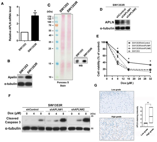 APLN was highly expressed and secreted in Dox-resistant SW1353R cells and reducing its expression enhanced sensitivity to Dox. (A) The expression levels of APLN mRNA were measured using qPCR. * p < 0.05 compared with SW1353 group. (B) The expression levels of APLN protein in total cell lysates were analyzed using Western blot. (C) The secretion of APLN in conditioned media (CM) from SW1353 and SW1353R cells was analyzed using Western blot. The amount of loading protein was evaluated using Ponceau S staining. (D) The protein levels of APLN in SW1353R/shControl, SW1353R/shAPLN#1, and SW1353R/shAPLN#2 cells were examined using Western blot. (E) Cells were exposed to increasing concentrations of Dox (0–32 μM) for 24 h, and subsequently cytotoxicity was evaluated by an MTT-based assay. The percentage of cell viability is shown relative to untreated controls. * p < 0.05 compared with shControl group. (F) Cells were treated with increasing concentrations of Dox (0–8 μM) for 24 h and the expression levels of cleaved caspase 3 were examined using Western blot. α-Tubulin was used as a loading control. (G) IHC staining for APLN in tissue microarray from low-grade chondrosarcoma (grade II, n = 13) and high-grade chondrosarcoma (grade III, n = 39). Scale bar = 100 μm.