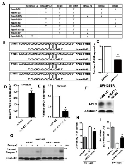2.3. miR-631 Can Target APLN to Reduce Its Protein Expression to Restore Dox Sensitivity in SW1353R Cells