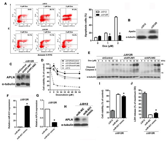 miR-631–APLN axis was also involved in Dox sensitivity in JJ012 cells. (A) Cells were exposed to increasing doses of Dox (0–2 μM) for 24 h and apoptotic cells were analyzed by the annexin V-FITC/PI approach. * p < 0.05 compared with JJ012 cells. (B) The expression levels of APLN protein in total cell lysates between JJ012 and JJ012R cells were analyzed by Western blot. (C) The protein levels of APLN in JJ012R/shControl, JJ012R/shAPLN#1, and JJ012R/shAPLN#2 cells were examined using Western blot. (D) Cells were treated with increasing concentrations of Dox (0–64 μM) for 24 h, and subsequently cytotoxicity was evaluated by an MTT assay. The percentage of cell viability is shown relative to untreated controls. * p < 0.05 compared with shControl group. (E) Cells were treated with increasing doses of Dox (0–64 μM) for 24 h and the expression levels of cleaved caspase 3 were examined using Western blot. α-Tubulin was used as a loading control. (F,G) After the miR-631 mimic was delivered into JJ012R cells, the expression levels of miR-631 and APLN were further analyzed by qPCR. * p < 0.05 compared with miR-NC group. (H) The protein expression of APLN was analyzed by Western blot. (I,J) miR-631-transfected JJ012R cells and their parental cells (JJ012 cells) were treated with 8 μM Dox for 24 h, and then the Dox susceptibility was determined by MTT and LDH assays, respectively. * p < 0.05 compared with miR-NC group.
