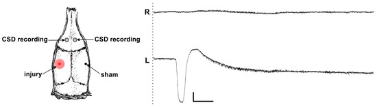 A single unilateral cortical spreading depolarization (CSD) induced by a local parenchymal injury of the somatosensory cortex and its propagation to the ipsilesional frontal cortex of an awake rat. Scheme shows the localization of the cortical microinjury, sham stimulation, and recording electrodes. A representative trace shows a single injury-induced CSD propagated to the left frontal cortex (L) but not invaded the contralesional right frontal cortex (R). The time of microinjury is marked by dashed line. Scale bars—50 s and 2 mV. Negativity is directed downward.