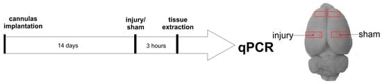 In PCR experiments, freely moving rats were individually placed in an experimental chamber (40 × 40 × 40 cm), and their behavior was video recorded during all the experiment. After a 5 min habituation period, a sham injury of the right somatosensory cortex was produced by the abovementioned method (insertion of a short cannula not damaging neuronal tissue) and, five minutes later, a standard microinjury of the left somatosensory cortex was induced by the way described previously (1 mm protruding of an injection cannula beyond the tip of an implanted cannula guide into cortical parenchyma). Three hours after the injury and CSD induction, the animals were decapitated and tissue samples from the perilesional left somatosensory cortex, sham-treated right somatosensory cortex, and right and left intact frontal cortical regions were extracted and stored at −80° C for further analysis (Figure 2).