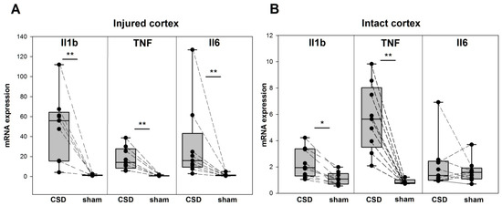 Proinflammatory cytokine expression following a single CSD in the injured and intact regions of the cerebral cortex. Levels of Il1b, TNF, and Il6 mRNA (medians with interquartile ranges and individual data from each rat, n = 9) in the perilesional tissue of the somatosensory cortex (A) and in the intact tissue of the frontal cortex (B) of the lesioned (CSD) and opposite (sham) hemispheres. * p < 0.017 and ** p < 0.0085—ipsilesional versus sham-treated cortical regions (post hoc Wilcoxon test with Bonferroni correction).