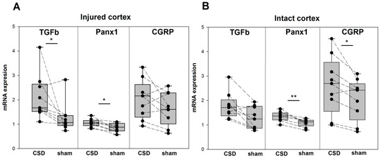 Expression of TGFb, Panx1, and CGRP following a single CSD in the injured and intact regions of the cerebral cortex. Levels of TGFb, Panx1, and CGRP mRNA (medians with interquartile ranges and individual data from each rat, n = 9) in the perilesional tissue of the somatosensory cortex (A) and in the intact tissue of the frontal cortex (B) of the lesioned (CSD) and opposite (sham) hemisphere. * p < 0.017 and ** p < 0.0085—ipsilesional versus sham-treated cortical regions (post hoc Wilcoxon test with Bonferroni correction).