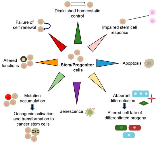 Most mammalian adult tissues contain resident tissue-specific stem cells responsible for homeostatic tissue maintenance and regenerative responsiveness to injury. Stem cells are undifferentiated and unique by their ability to produce differentiated daughter cells and retain their stem cell identity by self-renewal [44]. Due to their capacity to self-renew and differentiate, adult stem cells are often considered immortal reservoirs of youth [45]. They serve as a cellular backup of various organs, continuously renewing them by supplying new daughter cells with the set of cytokines and growth factors required for the regeneration and repairing of tissues/organs and keeping them integrated and functional throughout their life span [46]. During ageing, stem cells show multiple signs of functional decline compromising their self-renewal and proliferation. These age-associated progressively deteriorating changes deprive the organ-specific niches/microenvironment of functional growth and molecules needed for mutually concerted functioning between stem cells and their respective organs [47]. Menendez and Vazquez-Martinargue have suggested that “we are as old as our adult stem cells are” because endogenous stem cells become damaged as we age [48]. Accordingly, stem cell exhaustion manifested through their quantitative and/or qualitative decline has been recognized as one of the drivers of ageing [2]. Resident stem cells maintain the balance between cell loss and cell replacement until such equilibrium starts to be progressively reduced, and newborn cells cannot compensate for the ones that died [49,50]. Stem cell exhaustion, together with altered intercellular communications, represents the end result of other hallmarks of ageing and is ultimately responsible for the functional decline associated with ageing [2]. Molecular ageing of stem cells includes diminished homeostatic control, impaired stem cell response, senescence, apoptosis, aberrant differentiation, somatic mutations, altered functions and failed self-renewal (Figure 2) [51,52]. These changes are accompanied by altered expression of genes in ageing stem cells [53].