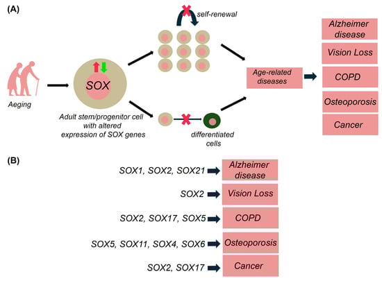Role of SOX genes in stem cell exhaustion and age-related diseases. (A) Altered expression of SOX genes in adult stem/progenitor cells lead to decrease of self-renewal capacity and inhibition of differentiation of these cells, leading to age-related diseases—Alzheimer diseases, Vision loss, Chronic obstructive pulmonary disease (COPD), osteoporosis, and age-related cancers. (B) Alteration in SOX genes expression is correlated with various age-related diseases, including neurodegenerative diseases, vision loss, (COPD), osteoporosis, and cancers. The scheme is based on the previously reported publications [96,98,102,103,104,105].