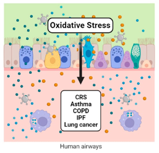 All those mechanisms are driven at the physiological level of ROS/RNS, known as oxidative eustress. Cellular antioxidant mechanisms maintain eustress, and when the formation of ROS/RNS overwhelms the cell’s antioxidant defense, molecular damage is produced, characterized as oxidative stress or distress [4]. Exogenous factors contributing to the generation of ROS/RNS include exposure to environmental pollutants, such as heavy metals (Cd, Hg, Pb, Fe, and As), certain drugs (cyclosporine, tacrolimus, gentamycin, and bleomycin), chemical solvents, cooking (smoked meat, used oil, and fat), cigarette smoke, vaping, alcohol, and radiation [5]. There is growing evidence that air pollution enhances oxidative stress and contributes to several diseases, from airway illnesses to DNA damage [6]. This review focuses on the participation of oxidative stress in the pathophysiology of respiratory tract diseases (Figure 1).