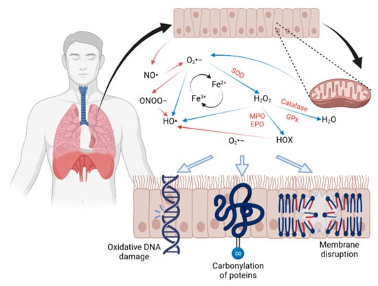 Air contaminants enter the respiratory tract. Once in contact with the epithelium, they increase the reactive oxygen and nitrogen species, which initiate a cascade of redox reactions that ultimately damage lipids, proteins, and DNA.