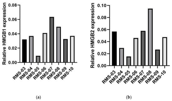 Gene expression of different HMGA and HMGB genes were analyzed in tumor samples from patients with RMS before BOMP-EPI treatment as the upfront therapy (RMS-05, RMS-06 and RMS-07), after relapse (RMS-04 andRMS-08) with other therapies (IVA/V or EPI-IFOS) or before relapse (RMS-03, RMS-09 and RMS-10) with other therapies (IVA/V or IVA). Mean HMGB1 and HMGB2 expression levels were approximately 10-fold higher than HMGA2 and HMGB3 or two times higher than HMGA1 (Figure 1). HMGB1 mRNA levels showed a significant negative Pearson correlation with OS (ρ = −0.714, p < 0.05) and a similar tendency with PFS (ρ = −0.626, p < 0.097; ρ = −0.752, p < 0.032 if we consider the PFS observed in RMS-05 after rechallenge of BOMP-EPI). HMGB1 mRNA levels in the patient with a complete response (RMS-05) were 3–10-fold lower than in the other patients (Figure 2a). No significant correlation was observed for HMGB2 and HMGA2 mRNA levels, which showed high variability in the different patients (Figure 2b,c).