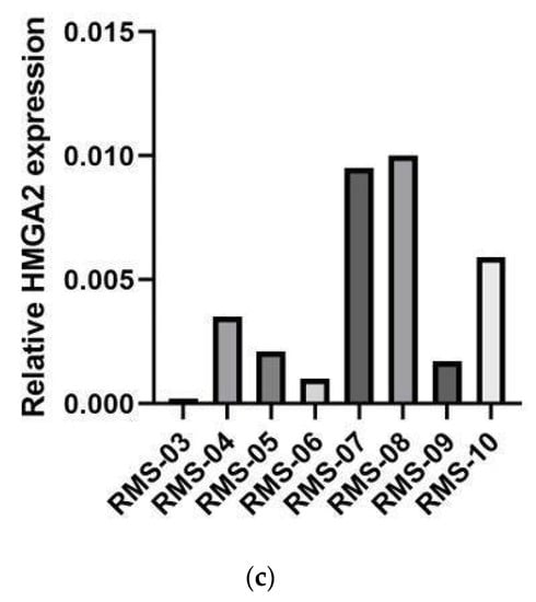 RNA was extracted from RMS cell lines with the RNA PureLink RNA Mini kit (Invitrogen, Carlsbad, CA, USA), quantified with the NanoDrop One C spectrophotometer (Thermo Fisher Scientific, Madison, WI, USA) and reverse transcribed to cDNA using the High-Capacity Reverse cDNA Transcription kit (Applied Biosystems, Thermo Fisher Scientific, Foster City, CA, USA). Expression levels of each gene were quantified by RT-qPCR in an ABI Prism 7900HT real-time PCR system by using the TaqMan Universal PCR Master Mix (Applied Biosystems, Thermo Fisher Scientific) and the specific TaqMan Gene Expression Assays (Applied Biosystems) HMGA2 (Hs00171569_m1), HMGB1 (Hs01923466_g1), HMGB2 (Hs01127828_g1) and GAPDH (Hs03929097_g1) as a housekeeping gene for data normalization.