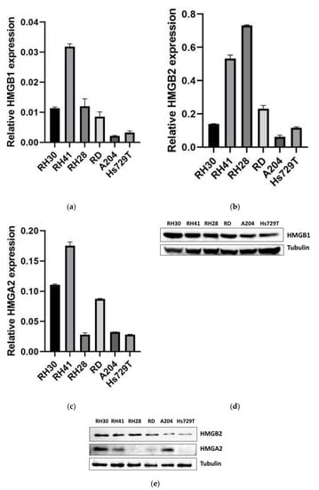 HMGB1, HMGB2 and HMGA2 expression in RMS cell lines. HMGB1 (a), HMGB2 (b) and HMGA2 (c) gene expressions in six RMS cell lines were analyzed by qPCR and normalized by GAPDH expression. RNA was extracted from each cell line 48 h after being seeded. HMGB1 (d), HMGB2 and HMGA2 (e) protein levels in RMS cell lines were analyzed by immunoblot using the specific antibodies for each protein and normalizing them by tubulin. The data from one of three independent experiments are shown. RH30, RH41 and RH28: alveolar rhabdomyosarcoma cell lines. RD, A204 and Hs729T: embryonal rhabdomyosarcoma cell lines.