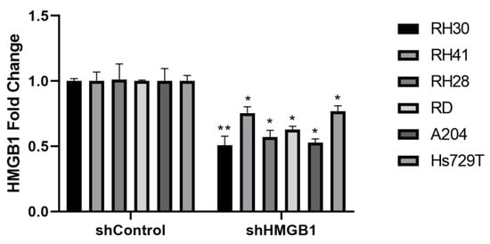 HMGB1 expression levels in RMS cell lines after HMGB1 knockdown. The HMGB1 gene expression in RH30, RH41, RH28, RD, A204 and Hs729T cell lines transduced with shHMGB1 lentivirus was compared against transduction with shControl lentivirus by qPCR, normalizing with GAPDH expression. * p < 0.05, ** p < 0.01, Student t test. RNA was extracted from each cell line 4 days after infection. The data from one of two independent experiments are shown. RH30, RH41 and RH28: alveolar rhabdomyosarcoma cell lines. RD, A204 and Hs729T: embryonal rhabdomyosarcoma cell lines.