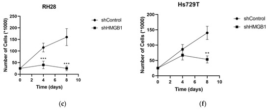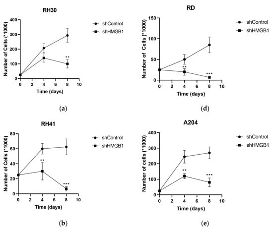 Proliferation of RMS cell lines after HMGB1 knockdown. The number of cells for the RH30 (a), RH41 (b), RH28 (c), RD (d), A204 (e) and Hs729T (f) cell lines was counted after 4 and 8 days of transduction with shHMGB1 lentivirus and compared against transduction with shControl lentivirus. ** p < 0.01, *** p < 0.001, Student t test. The data from one experiment are shown counting cells for quadruplicate in each point. RH30, RH41 and RH28: alveolar rhabdomyosarcoma cell lines. RD, A204 and Hs729T: embryonal rhabdomyosarcoma cell lines.
