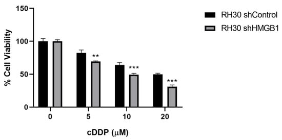 RH30 cell lines with stable downregulation of HMGB1 (RH30 shHMGB1) after transduction with shHMGB1 lentivirus were selected by puromycin treatment for 2 weeks as well as for transduction with shControl lentivirus (RH30 shControl). RH30 shHMGB1 cell lines were treated with cisplatin at 5, 10 and 20 µM over 48 h, showing additional sensitivity to a cisplatin dose of 20% versus RH30 shControl with the different cisplatin doses (Figure 6).