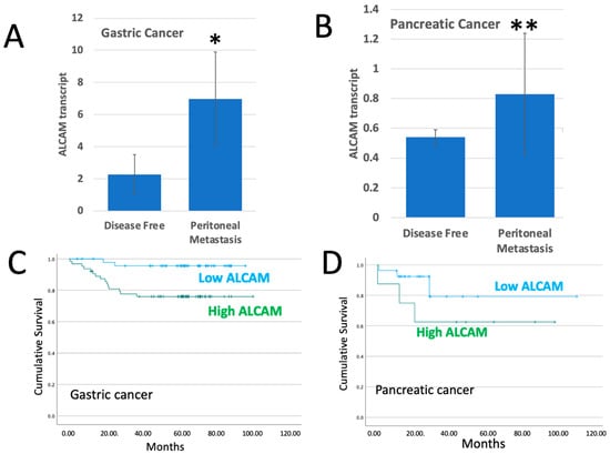 Our gastric clinical cohort recorded 18 patients who developed peritoneal metastasis and our pancreatic cohort recorded 6 patients with peritoneal metastasis. We compared the ALCAM transcript expression levels between the patients with peritoneal metastasis and the patients who remained uneventful (n = 112 for the gastric cohort and n = 35 for the pancreatic cohort). As shown in Figure 1, patients who had peritoneal metastases had significantly higher levels of ALCAM than those without (p = 0.037 for gastric cancer (Figure 1A) and p = 0.01 for pancreatic cancer (Figure 1B)).