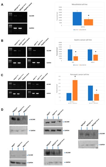 Creation of cell models with differential expression of ALCAM as confirmed by PCR (left panel) and quantitative PCR (right panel). (A): The ALCAM transcript expression in MET5A control (MET5AControl) and ALCAM knockdown cells (MET5AALCAM-KD). (B): The ALCAM transcript expression levels in HGC-27 control (HGC27Control) and ALCAM knockdown cells (HGC27ALCAM-KD) (left), as well as AGS control (AGS Control) and ALCAM knockdown cells (AGSALCAM-KD) (right). (C): The ALCAM transcript expression levels in PANC-1 Control (PANC1Control) and ALCAM knockdown cells (PANC1ALCAM-KD) (left), as well as MIA PaCa-2 Control (MIAControl) and ALCAM overexpression cells (MIAALCAM-OE) (right). *: ALCAM-modified cell lines which showed significant changes compared with their respective control cells (p < 0.05). (D): Knockdown of ALCAM protein in the respective cell lines as shown by protein blotting.