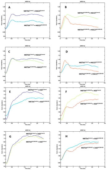 ECIS based evaluation of gastric adhesion to mesothelial cells. (A–D): Adhesion of HGC27 cells to MET5A mesothelial cells; (E–H): Adhesion of AGS cells to MET5A cells; Shown are monitoring at 4000 Hz. MET5AControl, AGSControl, HGC27Control: control transfected cells; MET5AALCAM-KD, AGSALCAM-KD, HGC27ALCAM-KD: cells with ALCAM knockdown by way of cell transfection. Replicate n = 4.
