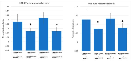 We created several cell models including MET5A mesothelial cells with ALCAM knockdown, AGS and HGC27 gastric cancer cells with ALCAM knockdown, PANC-1 pancreatic cancer cells with ALCAM knockdown and MIA PaCa-2 cells with ALCAM overexpression. To monitor if the changes of ALCAM in these cells impacted the interaction between cancer cells and mesothelial cells, we used the electric cell-substrate sensing (ECIS) as a method to trace the dynamic interactions between the two cell types. Gastric cancer control cells which expressed high levels of ALCAM adhered rapidly to control MET5A cells which also expressed high levels of ALCAM (Figure 3A for HGC27 and Figure 3E for AGS). However, following knocking down ALCAM in both gastric cancer cell lines, the pace of adhesiveness to control MET5A were substantially reduced (Figure 3A,E). Additionally, knocking down ALCAM from MET5A cells resulted in a marginal reduction of adhesion by control gastric cancer cells (Figure 3C for HGC27 and Figure 3G for AGS). More importantly, when ALCAM was knocked down from both mesothelial cells and gastric cancer cells, the interaction between the two cell types were greatly reduced compared to individual knockdown cells (Figure 3B,D,F,H). Figure 3 showed the electric resistance value of each ECIS experimental group 1 h after cancer cells were added. It is clear that adhesion of gastric ALCAM knockdown cells to mesothelial cells, control or ALCAM knockdown, was significantly reduced (Figure 4).