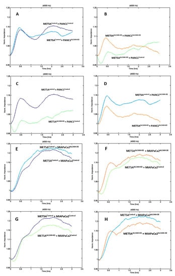 ECIS based evaluation of pancreatic adhesion to mesothelial cells. (A–D): Adhesion of PANC1 cells to MET5A mesothelial cells; (E–H): Adhesion of MIA PaCa-2 cells to MET5A cells. Shown are monitoring at 4000Hz. MET5AControl, PANC1Control, MIAPaCa2Control: control transfected cells; MET5AALCAM-KD, PANC1ALCAM-KD: cells with ALCAM knockdown by way of cell transfection; MIAPaCa2ALCAM-OE: cells with ALCAM overexpression by way of cell transfection. Replicate n = 4.