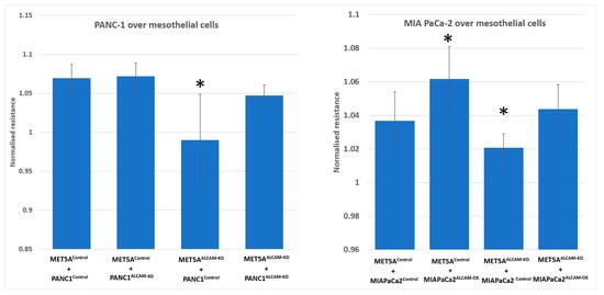 Similar to gastric cancer cells, we generated an ALCAM knockdown model from PANC-1 cell line which expressed high levels of ALCAM. In contrast, MIA PaCa-2 cells displayed low levels of ALCAM from which we created an ALCAM overexpression cell model. These created pancreatic cancer cell models were tested in the ECIS assay in a similar fashion to that of gastric cancer cells. As shown in Figure 5A–D, knocking down ALCAM from both the mesothelial cell MET5A and pancreatic cancer cell PANC-1 rendered a marked reduction of cell adhesion, similar to that seen with gastric cancer cells. In addition, overexpression of ALCAM in MIA PaCa-2 cells generated some marginal increases in the adhesiveness to MET5A cells (Figure 5E,F). This marginal increase is likely due to the low levels of ALCAM in the control cells and that over-expression only marginally increased the adhesiveness on the basis of the existing ALCAM. MET5A knockdown groups, which interacted with MIA PaCa-2 control or overexpression cells, also showed reduced cell adhesion compared with MET5A control groups (Figure 5G,H). Figure 6 showed the resistance value of each ECIS experimental group 1 h after cancer cells were added. It is clear that the adhesion of pancreatic cancer ALCAM knockdown cells to mesothelial cells, control or ALCAM knockdown, was significantly reduced (Figure 6).