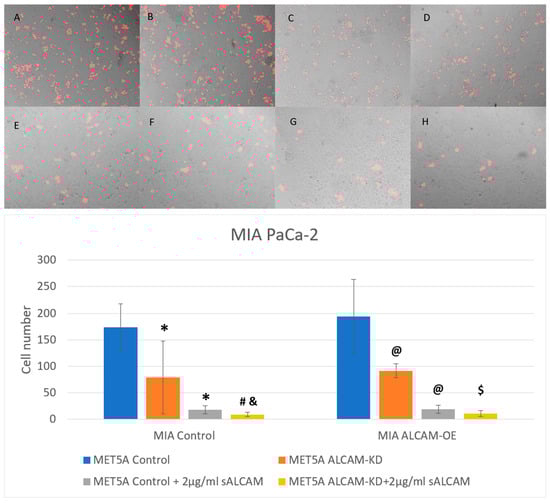 Interaction between pancreatic cancer cell line MIA PaCa-2 and mesothelial cell line MET5A as determined by the DiI based assays. (Top): Representative images (×10 magnification) of pancreatic cancer cells (MIA PaCa-2 Control and ALCAM overexpression cells) adherence to mesothelial cells (MET5A Control and ALCAM knockdown cells). (A–D) represent wells without any treatment and E-H represent wells treated with 2 µg/mL sALCAM. (A,E): MET5A control + MIA PaCa-2 control; (B,F): MET5A control + MIA PaCa-2 overexpression; (C,G): MET5A knockdown + MIA PaCa-2 control; (D,H): MET5A knockdown + MIA PaCa-2 overexpression. (Bottom): Graphical representation of pancreatic cancer cells (MIA Control and ALCAM overexpression cells) adherence to mesothelial cells (MET5A Control and ALCAM knockdown cells). *: Groups which showed significantly differences compared with “MET5A Control + MIA Control” group (p < 0.05); #: Groups which showed significantly differences compared with “MET5A ALCAM-KD + MIA Control” group (p < 0.05); &: Groups which showed significantly differences compared with” MET5A Control+ MIA Control + sALCAM” group (p < 0.05); @: Groups which showed significantly differences compared with “MET5A Control + MIA ALCAM-OE” group (p < 0.05); $: Groups which showed significantly differences compared with “MET5A ALCAM-KD + MIA ALCAM-OE” (p < 0.05).