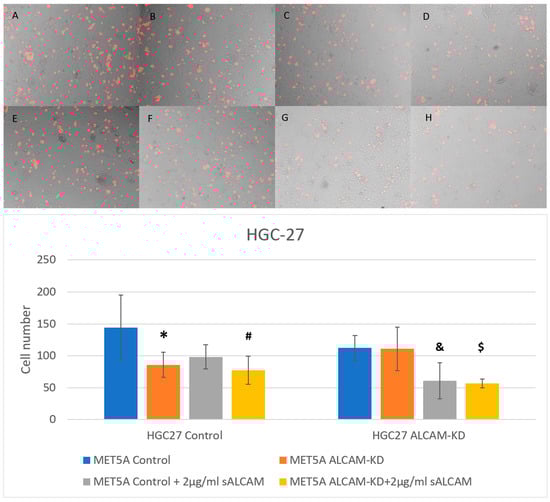 Interaction between gastric cancer cell line HGC-27 and mesothelial cell line MET5A as determined by the DiI based assays. (Top): Representative images (×10 magnification) of gastric cancer cells (HGC-27 Control and ALCAM knockdown cells) adherence to mesothelial cells (MET5A Control and ALCAM knockdown cells). (A–D) represent wells without any treatment and E-H represent wells treated with 2 µg/mL sALCAM. (A,E): MET5A Control + HGC27 Control; (B,F): MET5A Control + HGC27 ALCAM knockdown; (C,G): MET5A ALCAM knockdown + HGC27 Control; (D,H): MET5A ALCAM knockdown + HGC27 ALCAM knockdown. (Bottom): Graphical representation of gastric cancer cells (HGC-27 Control and ALCAM knockdown cells) adherence to mesothelial cells (MET5A Control and ALCAM knockdown cells). *: Groups which showed significantly differences compared with “MET5A Control + HGC27 Control” group (p < 0.05). #: Groups which showed significantly differences compared with “MET5A Control + HGC27 Control + sALCAM” group (p < 0.05); &: Groups which showed significantly differences compared with” MET5A Control+ HGC27 ALCAM-KD” group (p < 0.05); $: Groups which showed significantly differences compared with “MET5A ALCAM-KD + HGC27 ALCAM-KD” group (p < 0.05).
