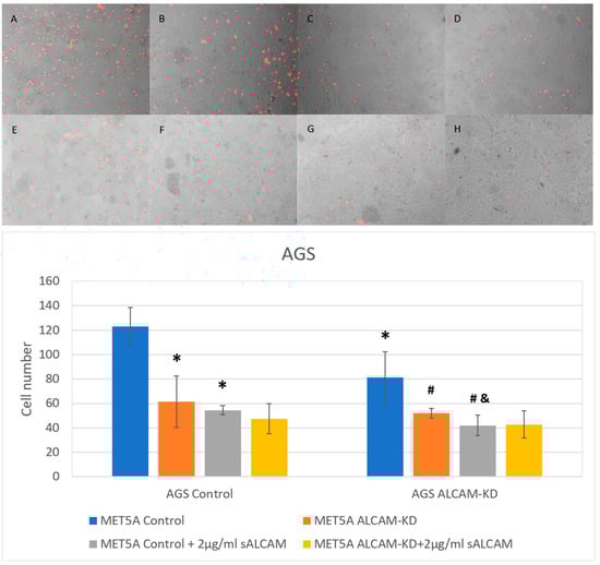 Interaction between gastric cancer cell line AGS and mesothelial cell line MET5A as determined by the DiI based assays. (Top): Representative images (×10 magnification) of gastric cancer cells (AGS Control and ALCAM knockdown cells) adherence to mesothelial cells (MET5A Control and ALCAM knockdown cells). (A–D) represent wells without any treatment and E-H represent wells treated with 2 µg/mL sALCAM. (A,E): MET5A control + AGS control; (B,F): MET5A control + AGS ALCAM knockdown; (C,G): MET5A ALCAM knockdown + AGS Control; (D,H): MET5A ALCAM knockdown + AGS ALCAM knockdown. (Bottom): Graphical representation of pancreatic cancer cells (AGS Control and ALCAM knockdown cells) adherence to mesothelial cells (MET5A Control and ALCAM knockdown cells). *: Groups which showed significantly differences compared with “MET5A Control + AGS Control” group (p < 0.05). #: Groups which showed significantly differences compared with “MET5A Control + AGS ALCAM-KD” group (p < 0.05); &: Groups which showed significantly differences compared with” MET5A Control + AGS Control + sALCAM” group (p < 0.05).