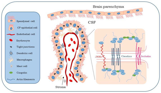 - Kratzer, I.; Vasiljevic, A.; Rey, C.; Fevre-Montange, M.; Saunders, N.; Strazielle, N.; Ghersi-Egea, J.F. Complexity and developmental changes in the expression pattern of claudins at the blood-CSF barrier. Histochem. Cell. Biol. 2012, 138, 861–879. [Google Scholar] [CrossRef]