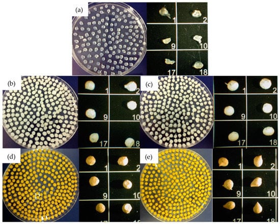 Beads images obtained with optic microscope. In order: (a) B; (b) B-MG; (c) B-MG_5.0Ce; (d) B-MG_curc5; and (e) B-MG_5.0Ce_curc5. The numbers identify different beads of the same sample.