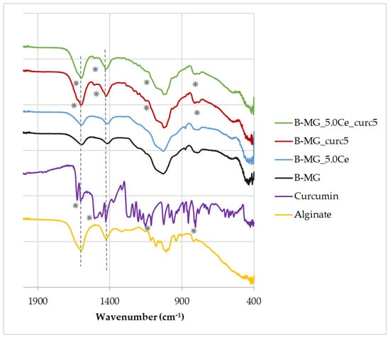 The FTIR−ATR spectra show that the characteristic peaks of alginate (dashed lines) at 1419 cm−1 and 1601 cm−1 [] are present in all samples, whereas the characteristic peaks of curcumin (asterisks) at 1630 cm−1, 1516 cm−1, 1093 cm−1, and 798 cm−1 [] are present only in B-MG_curc5 and B-MG_5.0Ce_curc5, providing further evidence of the success of curcumin uploaded.