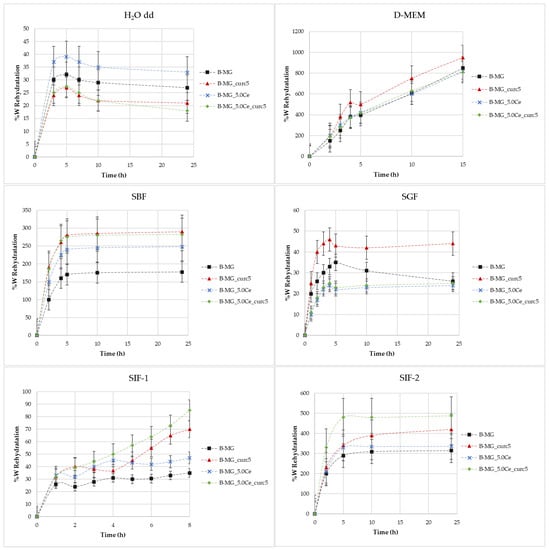 Figure 4 shows the rate of rehydration (%W) as a function of time in different media: H2O, simulated body fluid (SBF), Dulbecco’s Modified Eagle Medium (D-MEM), and simulated gastric fluid (SGF) and simulated intestinal fluid (SIF) with various buffers.