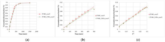 Curcumin release kinetics from P-MGs; (a) graph of the curcumin fraction released in the first 24 h compared with the amount contained in 50 mg; (b) linearization according to Peppas’ model (n = 1); and (c) linearization according to Higuchi’s model.