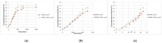 Curcumin release kinetics from B-MGs in SBF; (a) curcumin fraction released in the first 24 h for the two samples B-MG_curc5 and B-MG_5.0Ce_curc5; (b) linearization according to Peppas’ model (n = 1); and (c) linearization according to Higuchi’s model (n = 0.5).
