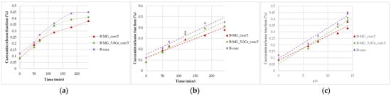 Both MGs and beads were studied. For all the samples, the same mathematical model, Higuchi’s model [], can be applied (Equation (1)). The release has been detected for 24 h, but models must be applied only in the time interval in which the release has significant values; under this condition, the equation is linear.