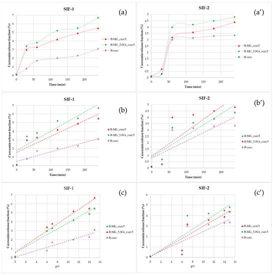 Representations of the kinetics release of the beads in SIF. (a,a′) Percentage fraction of time-released curcumin; (b,b′) linearization according to Peppas’ model; and (c,c′) linearization according to Higuchi’s model.