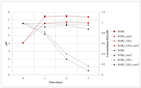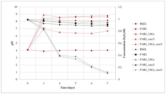 For all samples, an increase of pH is registered during the first 24 h due to the release of Ca2+ in solution (Figure 9). This effect does not affect the Ce3+ catalytic activity, which occurs both at physiological and slightly basic pH (pH of approximately 7 for P-MG_5.0Ce and 8 for P-MG_5.0Ce_curc5).