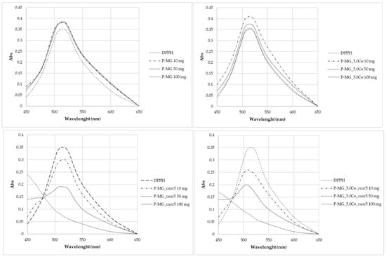 Different amounts of samples were used: 10 mg, 20 mg, 30 mg, 50 mg, 70 mg, and 100 mg. All samples were added to 10 mL of DPPH 6 × 10−5 M and incubated at 37 °C, 120 rpm, in the dark for 2 h. Simultaneously, a blank solution of only DPPH was prepared and incubated. After incubation, the solutions were centrifuged, and the supernatants were collected and analyzed spectrophotometrically. At the same time, to evaluate the antioxidant activity of curcumin, assuming a loading of 15% of curcumin inside MG and a complete release of it in solution, an analogous solution (10−2 M in methanol) was prepared.