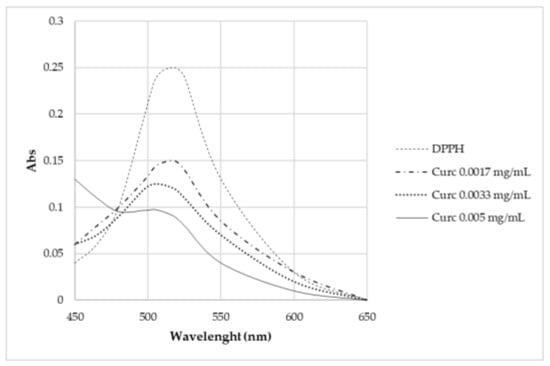 Curcumin expresses activity as a radical scavenger []. For this region, this work also investigated the concentration at which curcumin does not cause the complete degradation of DPPH (Figure 13). Different concentrations were studied: 5·10–3 mg/L, 3.3·10–3 mg/L, and 1.7·10–3 mg/L. None of these solutions brought about the complete degradation of DPPH in 2 h time.