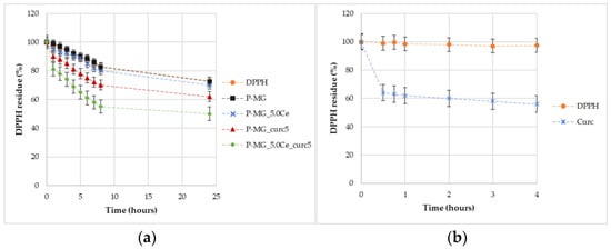 To determine the DPPH degradation kinetic constant, a solution with the same concentration as the previous one was prepared (0.33 g of P-MG in 1 mL) but different timing was studied: 1 h, 2 h, 3 h, 4 h, 5 h, 6 h, 7 h, 8 h, and 24 h. In addition, a reference solution of curcumin was prepared (0.50 mg of curcumin in 10 mL of a DPPH solution 6∙10⁻5 M).