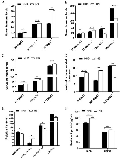 Differences in endocrine hormones, antioxidant enzymes and heat shock proteins between the NHS and HS groups. (A–D) serum endocrine hormones. (E) serum antioxidant enzymes. (F) serum heat shock protein. Data are presented as the mean ± SEM (n = 20 per group); * p < 0.05, *** p < 0.001.