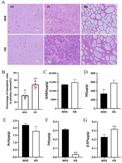 Histomorphological observation of HPM-axis related tissues and neurotransmitters in hypothalamus between the NHS and HS groups. (A) Histomorphological observation of HPM-axis related tissues. HY: hypothalamus; PI: pituitary; MA: mammary gland. (B) The percentage of basophils in pituitary. (C–G) Neurotransmitters in hypothalamus. Data are presented as the mean ± SEM (n = 6 per group); *** p < 0.001.