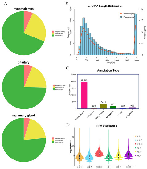 2.3. Identification and Characterization of circRNAs in HPM Axis Tissues of Dairy Cow under Heat Stress