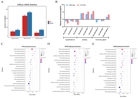 (A) Statistics of differential expression of miRNAs. (B) Comparison of the miRNAs expression levels determined by RNA-seq and RT-qPCR. (C–F) KEGG pathway analysis on the target genes of DE miRNAs in the hypothalamus, pituitary and mammary gland in dairy cows under heat stress.